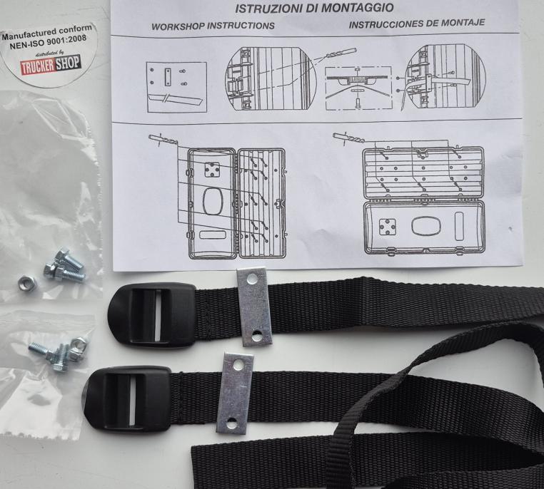 • 1x upevňovací sada (2x textilní popruhy s průvleky a montážní sadou)  pro rychlé upevnění a uvolnění hasícího přístroje k tělu schránky